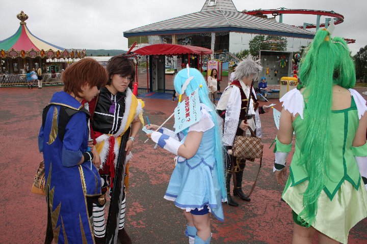 二回目のショーが終わった辺りから雨が本降りになってきてしまいました・・・・・・・ まぁ、時間的には16:00〜17:00くらいだったんで、この時点でお帰りになられる方々もチラホラと(´ω`;; 次のRAVE開催イベントでは雨が降らないよう、何本か人柱を用意しておきますので御容赦下さいませ(マテ 反動で晴れ過ぎてしまった場合は、容赦無くその人柱をへし折って下さいませ・・・・・・って、ソレで土砂降りになったら嫌だよね(^^;; 今までのRAVE開催イベントって、黙って考えてみたら天気が両極端で中間ってのは殆ど無かったような気が・・・・ って 中間なんて数える程しか無いよ;;´д`) 去年はアホみたいに暑かったしさ いつだったかはアホみたいに雨が降るしさ イベントの神様、お願いですから ”丁度良い天気” を我々に与えて下さいませ ←かなり切実です(´ω`;; さて、本気で次回に向けての人柱を選定しておこう 何処に吊るそうかね??(ヲイ さてさて、雨が降ってきたって事もあり、メインの広場の食堂や上の観覧車のゴンドラを使った小屋なんかの雨をしのげる所で皆様楽しくオハナシなんぞをしていた御様子 撮影等々は残念な結果になってしまいましたが、普段なかなか会えないような遠方のお友達と楽しまれていたようですね♪ 今回は観覧車も案外と人気でしたね そういや、悪天候でジェットコースターがほぼ止まっていた状態だったんだよなぁ・・・・・ あちこちで”ジェットコースターに乗りたかった!!”なんてオハナシを聞いて申し訳ない気分になってしまったり・・・ 次回はきっと晴れる!!晴れてくれる!!ってコトで何とか勘弁して下さい(^^;; さてさて、ここからは撮影させて下さいました方々の御紹介〜ヽ(´ー`)ノ |