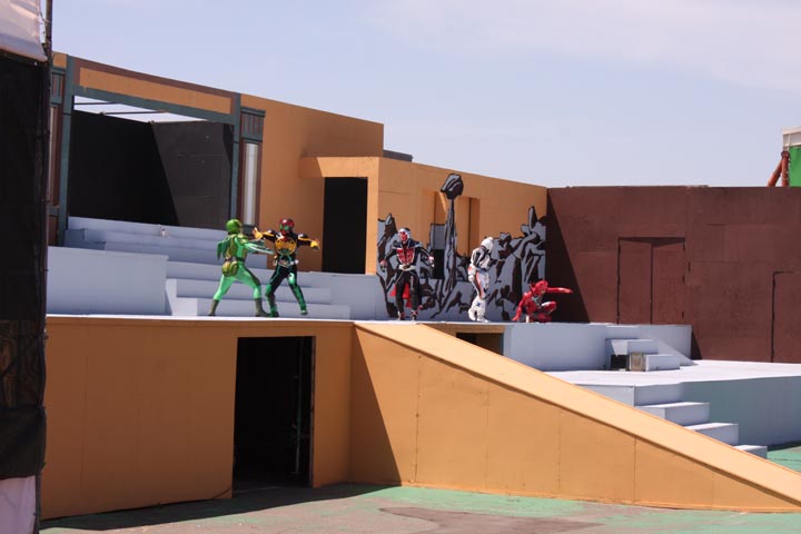 ストロンガーに恐れをなして逃げ出す下っ端怪人w ステージ上では後輩ライダー達の活躍が!! |